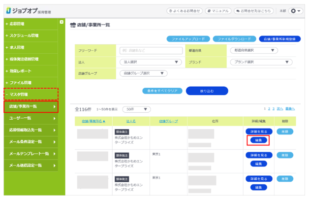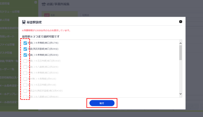最寄駅「〇〇駅から徒歩〇分」の、設定駅数を変更できるか 以下の方法にて、最大3件まで選択、変更可能です。(本部ユーザーのみ)マスタ管理>店舗/事業所一覧 にて該当店舗の「編集」をクリックします「最寄駅設定」をクリックします表示させたい駅名にチェックをいれ、「確定」をクリックし、更新します 関連記事 最寄駅が登録できない 店舗・事業所登録の際に、住所はどこまで省略できるか 徒歩での所要時間による最寄り駅の制限はできるか 求人案件アップロードで「ほかの人に更新されています」というエラーが出る 応募情報アップロードによる選考ステータスの変更方法