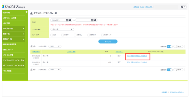 ステータスが「完了」になるのを待ち「ダウンロードファイル名」をクリックし、excelファイルを開く